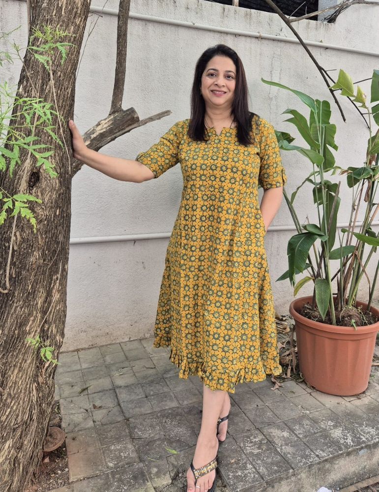 Cotton Ajrakh Frill Pattern Onepiece Yellow